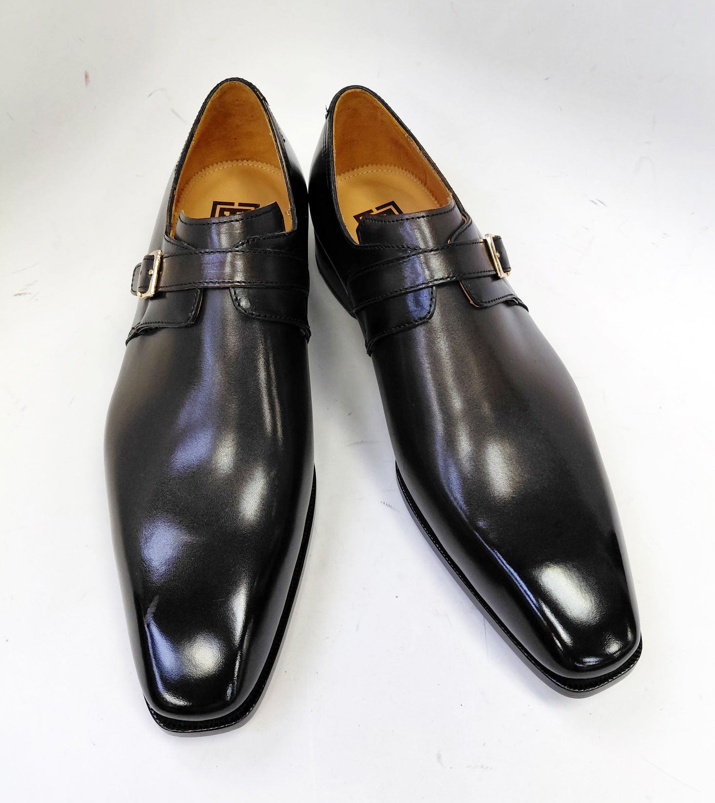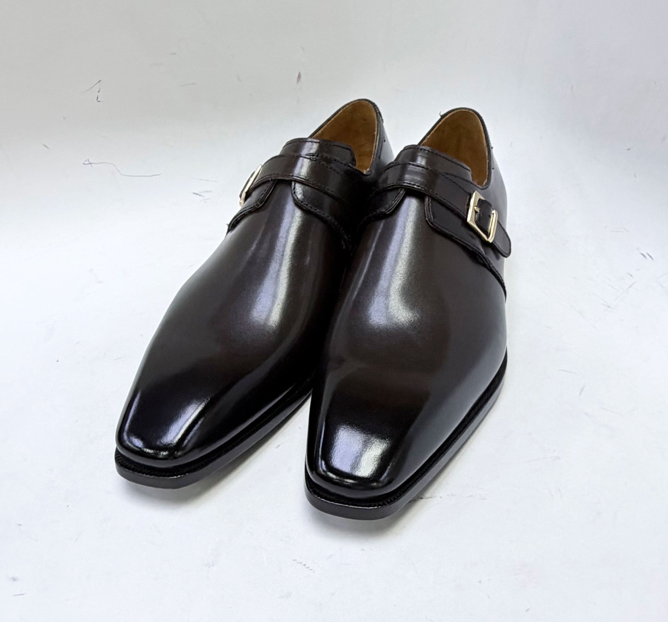 Completely Handmade. this Exquisite new Hand Burnished slip-on Monkstrap shoe from the Ugo Vasare collection features Goldtone buckle closure. a wheeled welt and a full Leather Sole! Matching Belt Available. Don't see your size? Call us to place a Special Order in Your Size.