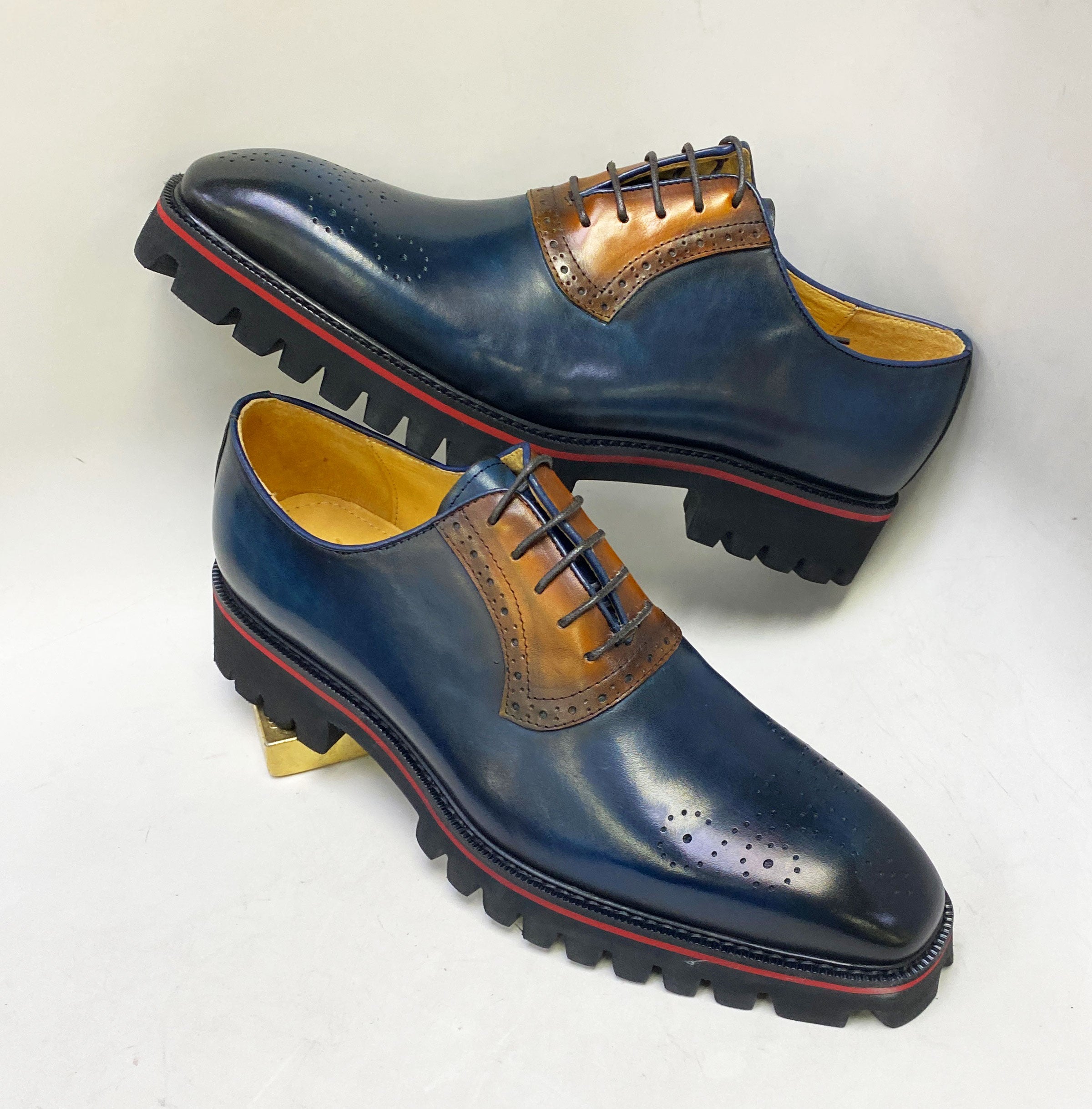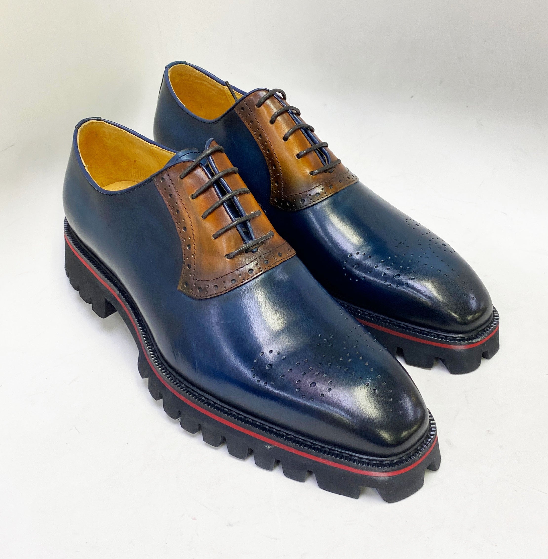 Stunning lace-up Oxford from the Maurice collection in Two-Tone Burnished Calfskin features Decorative Perforations with a Toe Medallion. soft Calfskin lining. a stitched. wheeled welt. and a Comfortable Rubber Lug Sole!