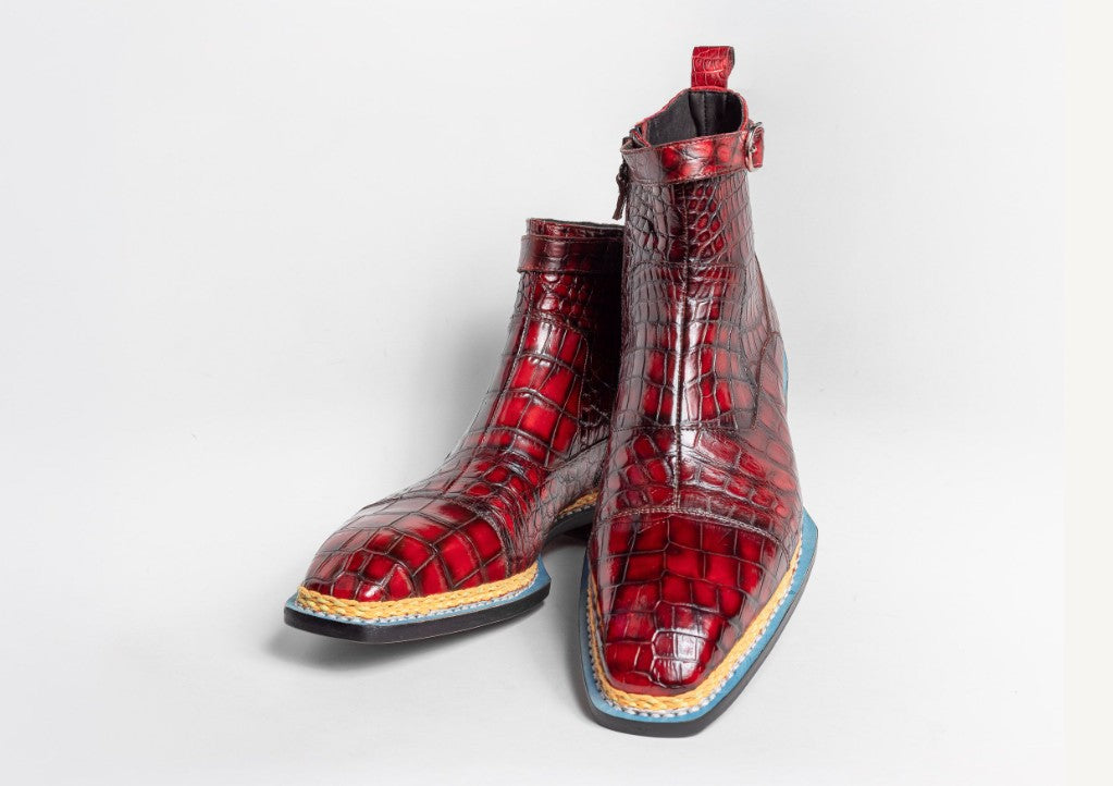 Exclusively for C & E. this Completely Handmade. Hand Burnished Genuine Alligator Slip-On Boot from our Maurice Custom Made Collection features Handmade Norwegian Welted Construction. an Inside Zipper for easy access. soft Calfskin lining. a Tone on Tone Braided stitched welt and a full Leather sole! Available by Special Order Only in Black. Brown. Burgundy. Tan. Grey. Blue. Sport. Green. Purple & Cognac. ONCE ORDERED. THE SHOES WILL BE SHIPPED IN 3-4 WEEKS. Exchange only within 14 Days. Matching Belt Sold Separately.